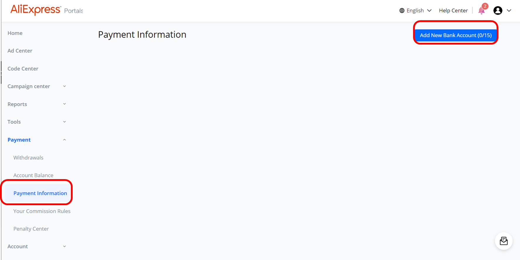 알리 포탈에 로그인 하신 다음 payment – payment information – add new bank account를 통해서