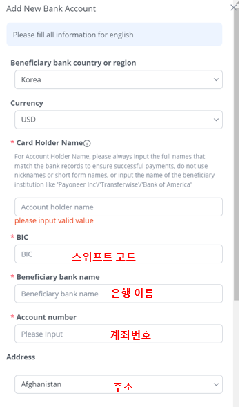 이름과, BIC는 스위프트 코드, Bank Name은 이름을 쓰시면 됩니다.