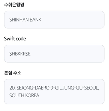 그리고 bank name에는 shinhan bank를 넣으시면 됩니다.