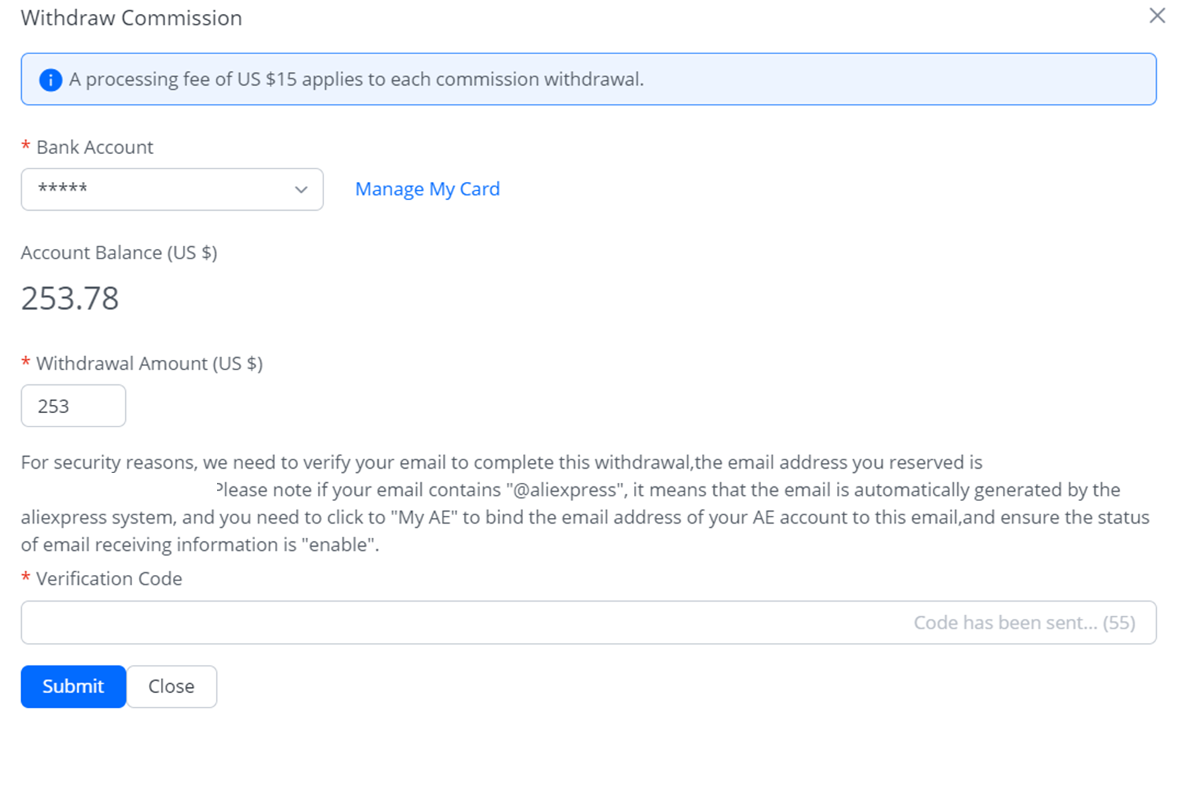 회원 가입 후 알리 어필리에이트는 15달러 이상의 수익이 생겨야지 인출이 가능한데요.