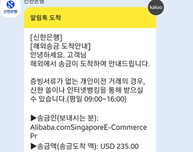 송금인이 alibaba.comsingaporeE-commercepr 이라는 이름으로 입금이 됩니다.