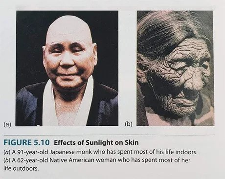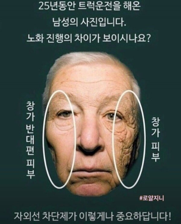 이 뿐만 아니라 25년 동안 트럭 운전을 하신 남성의 사진이라고 합니다. 창가와 창가 반대쪽 즉 햇빛의 유무에 따라서 피부의 노화 정도가 확연하게 차이가 납니다.